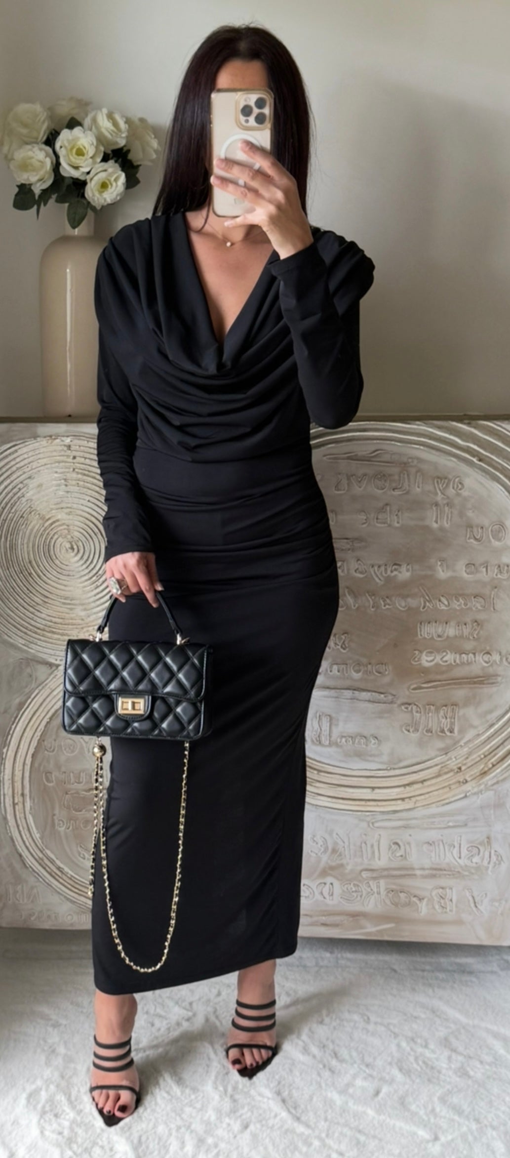 Cette robe longue noire associe une coupe près du corps et un effet drapé pour un rendu à la fois chic et confortable. Son col flatteur met en valeur le décolleté, tandis que les manches longues apportent une touche sophistiquée. Parfaite pour une tenue élégante au quotidien ou une soirée.